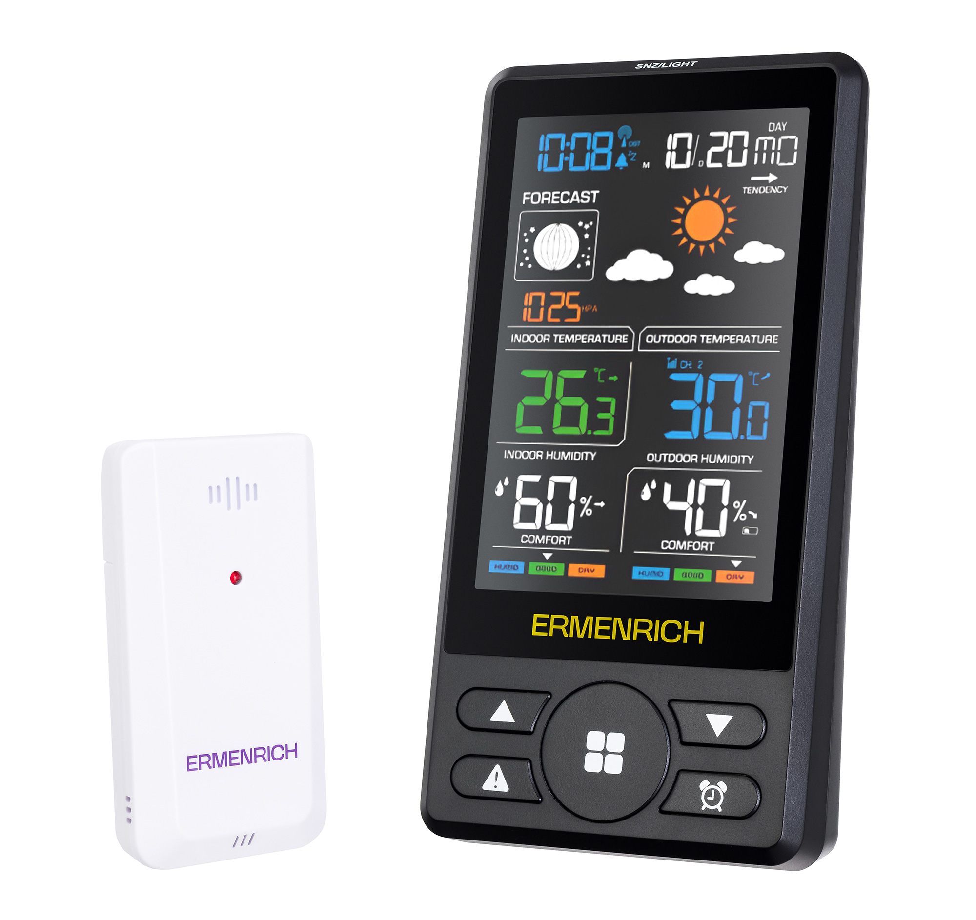 Домашната метеорологична станция Ermenrich Report WR50 има широк спектър от функции, което е безценно в ежедневието. Тя помага за проследяване на промените във времето навън и управлението на микроклимата вътре. Големият цветен екран показва цялата важна информация за атмосферата: температура и влажност на закрито и на открито, атмосферно налягане, прогноза за времето и ниво на комфорт. Уредът може да функционира и като цифров часовник и календар, като долната част на дисплея е отделена за тази информация. Когато се постави на нощно шкафче, може да служи и като будилник. Тези, които се интересуват от астрономия или народни вярвания, ще се радват да видят още един полезен параметър, показан на екрана: фазите на луната.