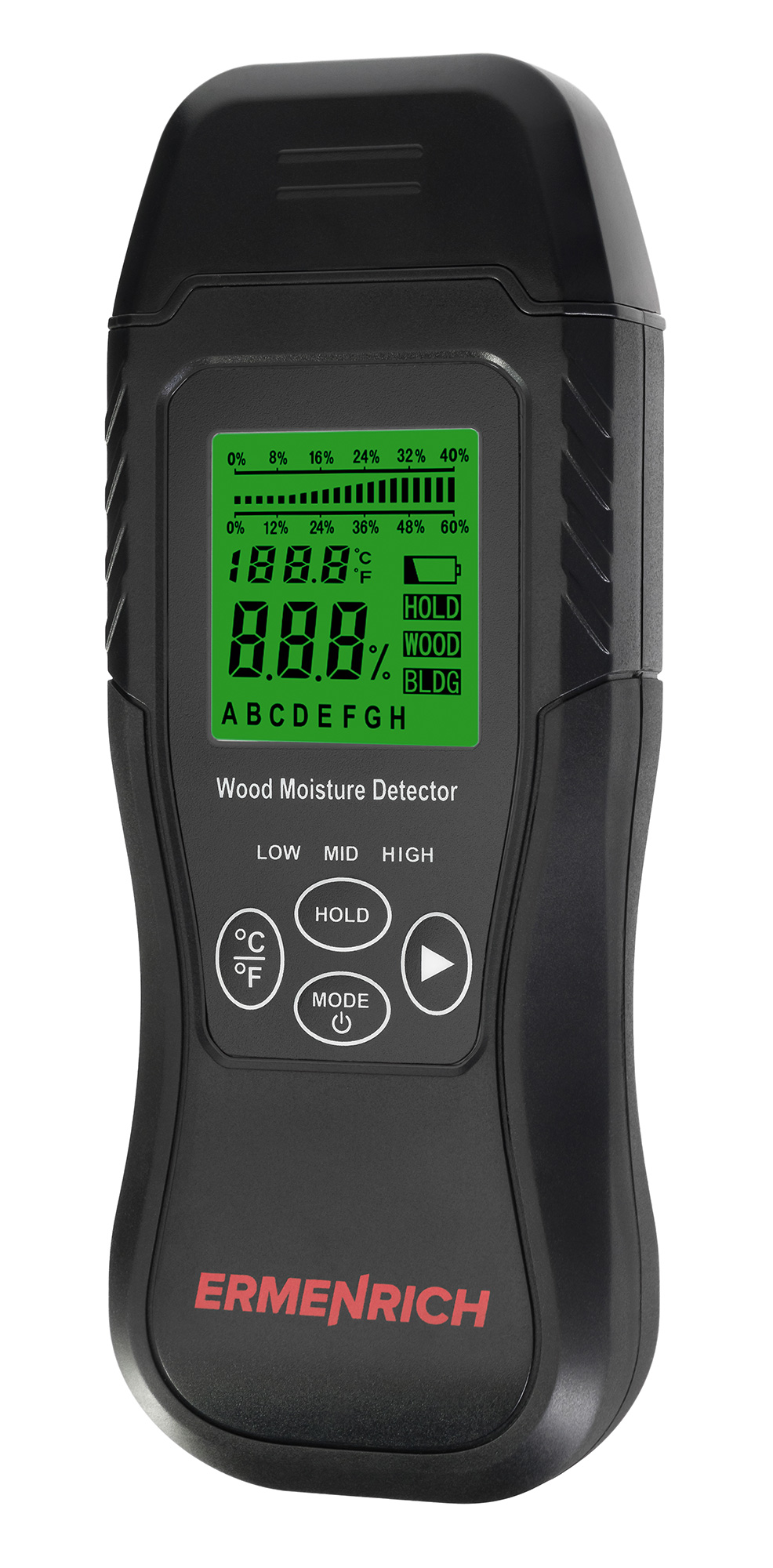 Преносимият детектор за влага Ermenrich Wett MW30 (влагомер) ви позволява бързо да измервате съдържанието на влага в строителни материали и продукти от дърво. Това е особено важно за снабдяването с материали, производството, дърводелството и поддръжката на домакинството. Устройството може да работи върху материали като картон, дървен материал, бетон, гипс и др. Има вграден термометър, който може да измерва температурата в две мерни единици: Целзий и Фаренхайт.