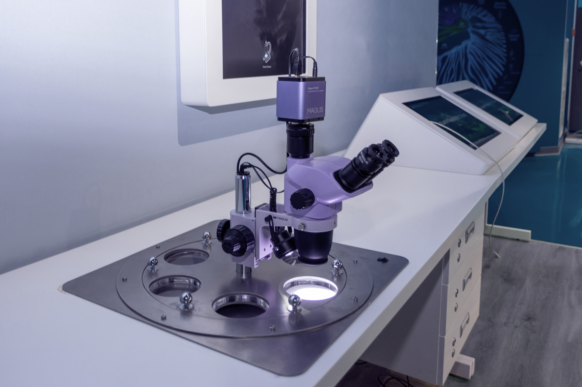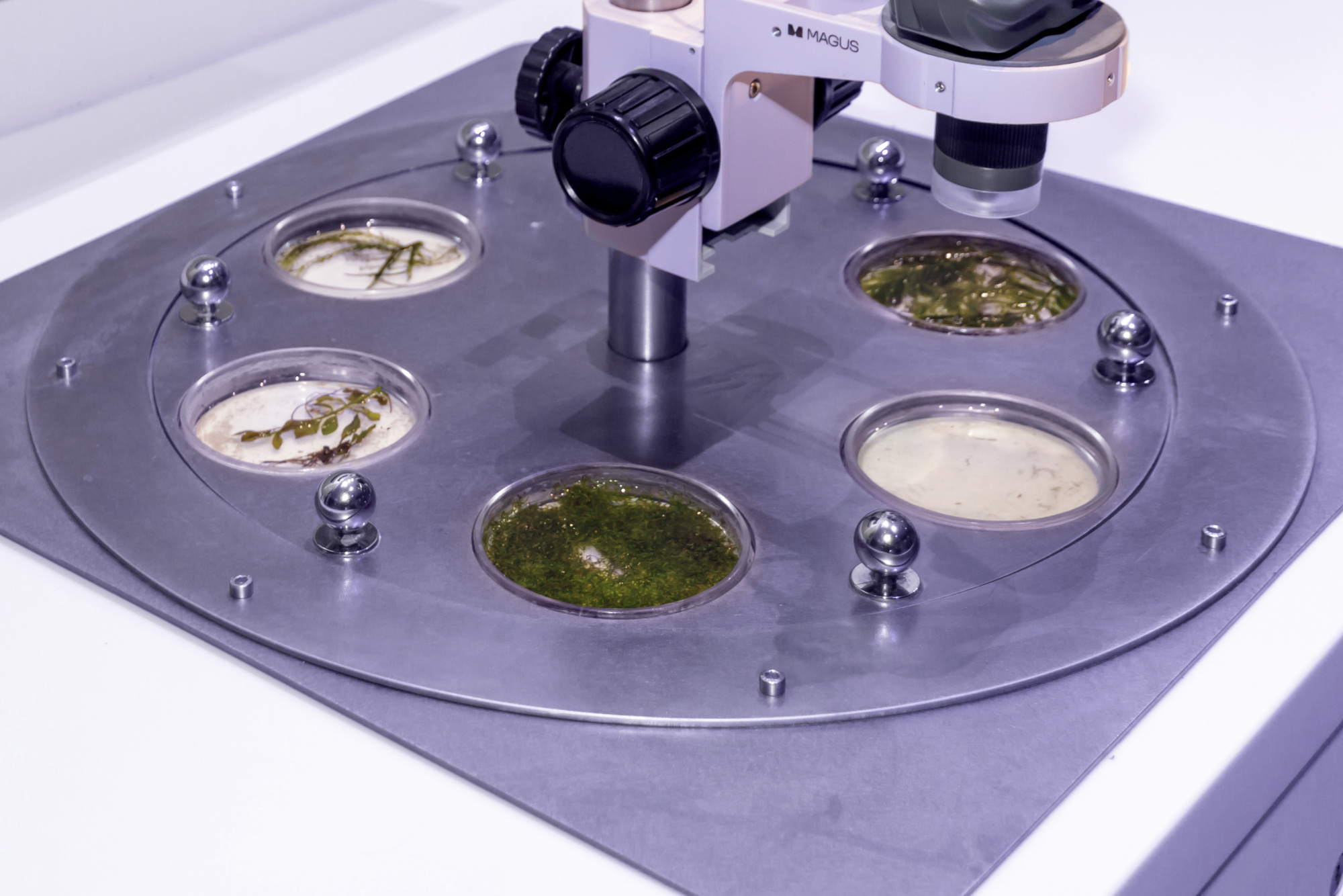 Изследователските станции са оборудвани със стереомикроскопи, цифрови камери и екрани. Благодарение на тази конструкция, всеки посетител може да използва микроскопа, да сменя самостоятелно образеца и да разглежда тъканни проби и микроорганизми на голям екран.